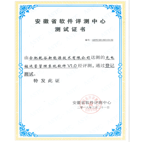 安徽省软件评测中心测试证书-非车载充电桩充电控制软件V1.0