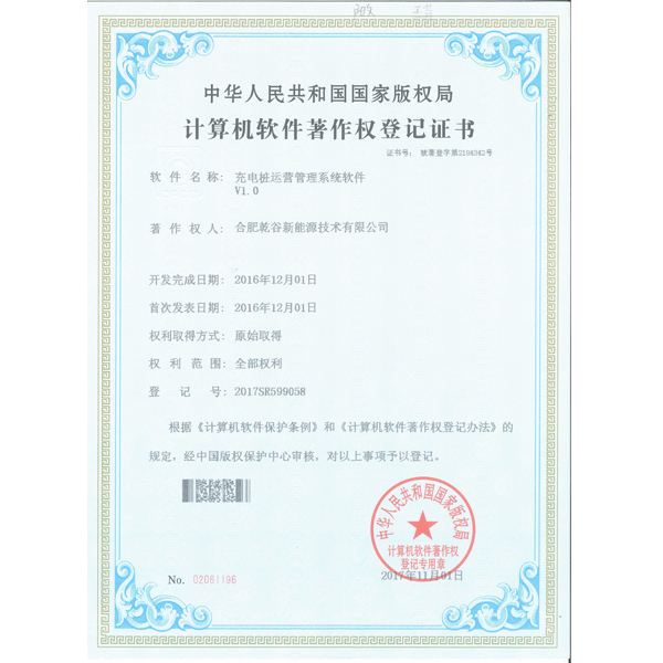 计算机软件著作权登记证书-充电桩运营管理系统软件V1.0